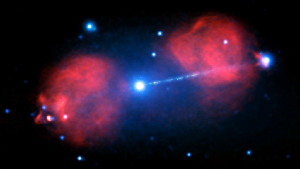 Astronomers have published new images of a bright jet of material, long enough to cross the Milky Way three times, fired into space by the black hole at the heart of a distant galaxy.
